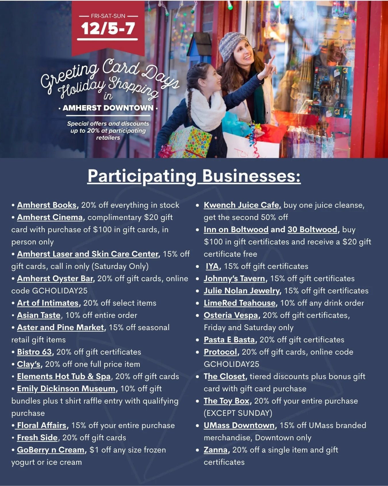 We partner with the Town, businesses, property owners, residents, cultural and educational institutions to create an inclusive, welcoming, and thriving destination—where businesses grow, community life flourishes, and visitors experience the unique charm of Amherst.