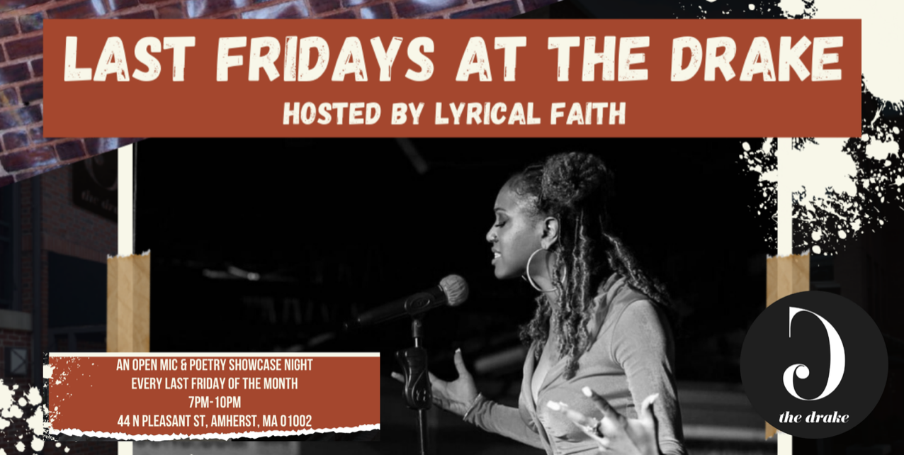 Last Fridays: Poetry Series hosted by Lyrical Faith Friday, October 28, 2022 7:00 PM 10:00 PM 19:00 22:00 The Drake 44 North Pleasant Street Amherst, MA, 01002 United States (map) Google Calendar ICS $10 Cover, $5 students w/ ID7pm-10pmBar opens at 5pm