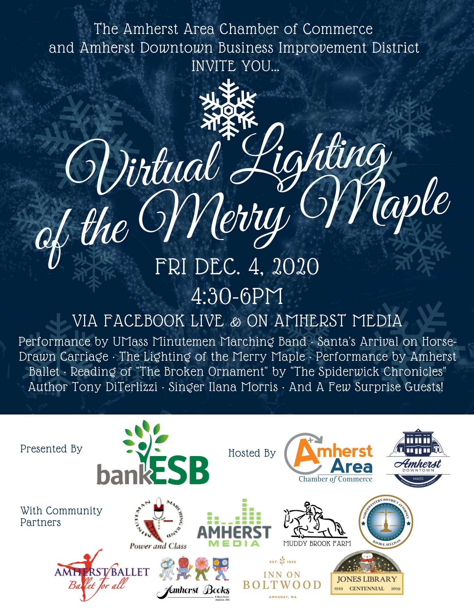 The Amherst BID and Amherst Area Chamber are excited to announce the celebration of the Lighting of the Merry Maple on Friday, December 4, from 4:30 to 6 p.m in a live-streamed broadcast of the tree lighting, with Santa Claus arriving in horse-drawn carriage to countdown and light up the maple at 5 pm for winter. The illumination kicks off an hour of special recorded events, including: the UMass Minuteman Marching Band performing Santa Claus is Coming to Town; singer Ilana Morris winner of the Amherst Center Cultural District’s Artist Contest for Song/Dance, will perform a rendition of Ariana Grande’s Winter Things, Madeline Bonn of Amherst Ballet will supervise filming of a student Sydney Mager performing The Dance of the Sugar Plum Fairyfrom The Nutcracker, and nationally recognized local author Tony DeTerlizzi, of the Spiderwick Chroniclesfame, will read from his book The Broken Ornament.